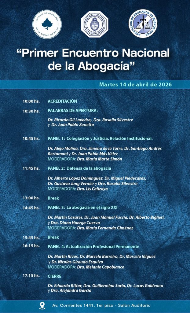En el Colegio de Público de Abogados CABA, se llevará a cabo el Primer Encuentro Nacional de la Abogacía el próximo 14 de abril. El propósito del Encuentro es consolidar un ámbito de diálogo institucional que permita enriquecer la gestión de los Colegios, fortalecer la defensa de la profesión y construir una agenda común frente a los desafíos del presente y del futuro.